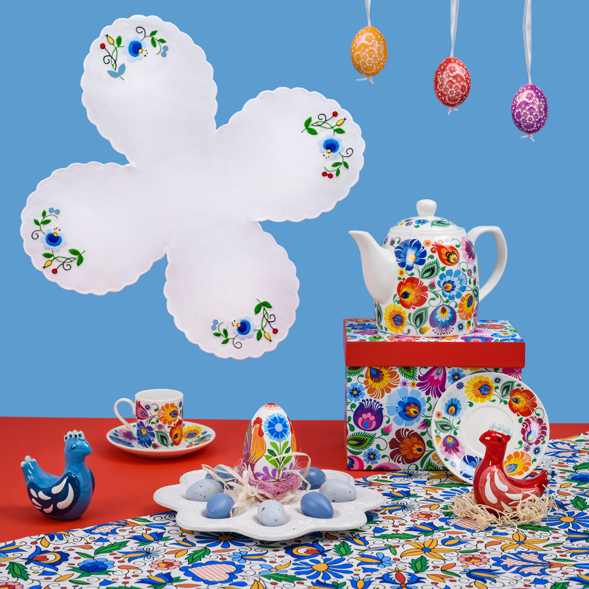 Jak mawia porzekadło – cudze chwalicie, swego nie znacie. Dlaczego zatem nie wy- brać się w ludową podróż przy okazji Wielkanocy? Zaaranżujcie swój stół tak, jak fol- kową mozaikę! Połączcie łowieckie kolorowe kwiaty z charakterystycznym kaszub- skim błękitem, dodajcie odrobinę czerwieni, która symbolizuje miłość do ziemi i sprawcie, by te Święta były naprawdę wyjątkowe. Tradycyjne pisanki świetnie pre- zentują się w towarzystwie białych naczyń. Nie obawiaj się dodać do nich filiżanki i dzbanka z folklorystycznym designem.