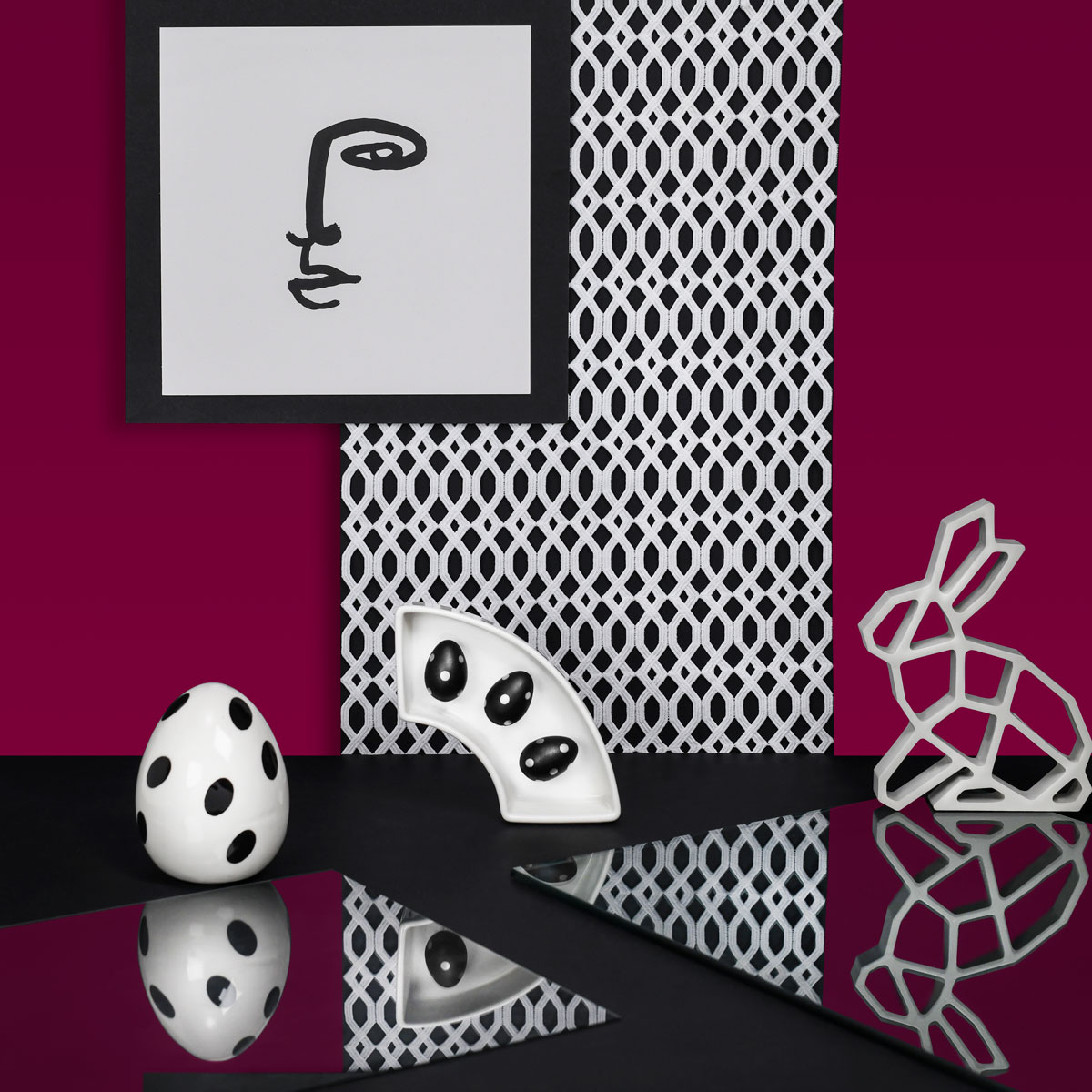 Kontrast pozwala wybrzmieć formie i geometrii. Jeśli lubisz nowoczesne rozwiązania łącz te same wzory w różnych rozmiarach, np. małe i duże groszki, wybieraj nietypowe materiały jak chociażby obrusy czy ozdobne figury przypominające druk 3D i uzupełnij je monochromatyczną sztuką. Tego typu zestawy nie lubią konkurencji innych kolorów!