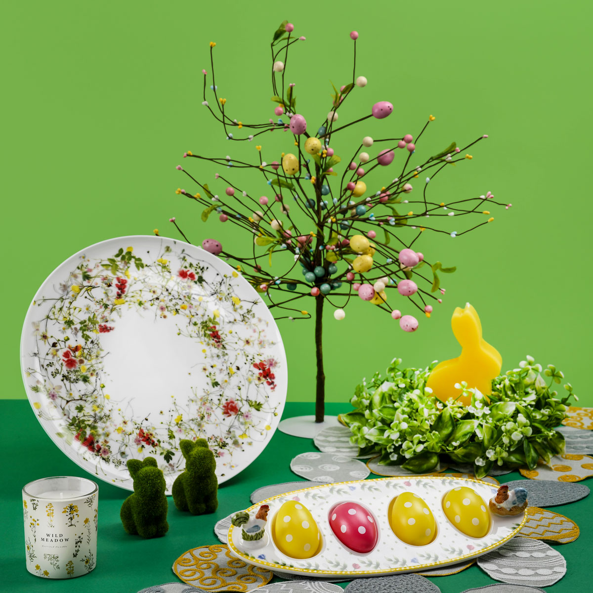 Wiosna na stole! Kwiaty rozkwitają na talerzach, świecach i dekoracyjnych paterach, a ozdobne drzewka zyskały wielkanocne pąki. Ten zestaw w kolorystyce nawiązuje do klasycznych świątecznych barw, w których królują zieleń i żółty. Dekoracje w tym stylu spodobają się osobom, które lubią romantyczny klimat. Do całości dodaj już tylko wielkanocne wypieki i bukiet tulipanów!