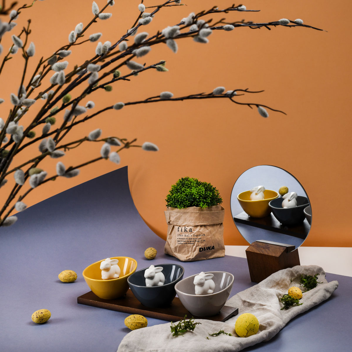 Mimo prostych form skandynawskie domy mają w sobie coś, co od wielu lat nas w nich pociąga. Oprócz użyteczności każdemu przedmiotowi towarzyszy design, który sprawia, że zwykła miseczka, prosty kubek czy lustro zyskują wyjątkowy charakter. Ceramika uzupełniona miękkimi tkaninami w naturalnych kolorach (zasłony, serwety i obrusy) i klasycznymi żółtymi pisankami stworzy przytulny nastrój. Ozdoby wielka- nocne w skandynawskim stylu to także bliskość natury – postaw na stole bukiet z bazi, ułóż rzeżuchę albo inne zielone rośliny w papierowych donicach i nie zapomnij o drewnianych akcesoriach!