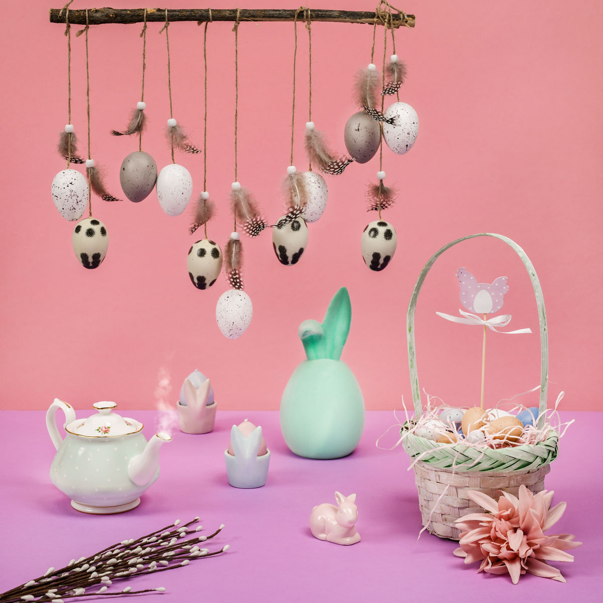 Styl boho w odmienionej wersji? Tradycyjne beże, brązy i oranż zamień na pastele! Wielkanocny stół ozdób też jajkami bez wzorów, a na ścianie czy nad nim powieś kompozycję z wydmuszek i piórek w neutralnych barwach – doskonale uzupełnią pudrowy róż, delikatny lila oraz orzeźwiający miętowy. Dodaj świece i dekoracyjne figury, a całość uzupełnij porcelaną o tradycyjnej formie.
