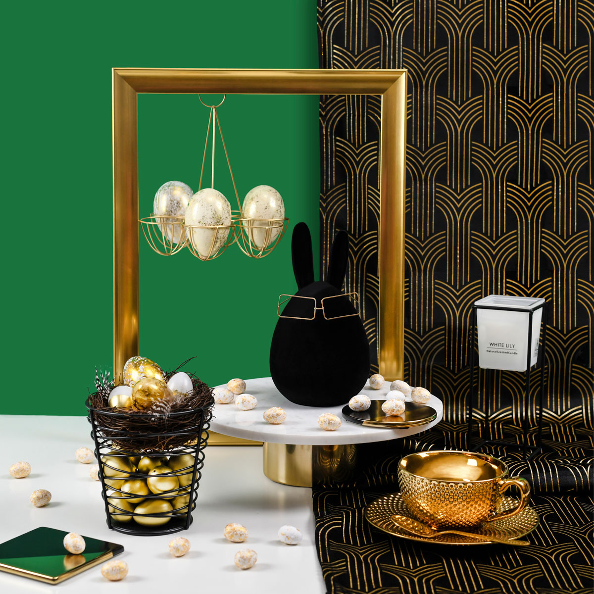 Gdyby Wielki Gatsby urządzał wielkanocne przyjęcie mogłoby ono wyglądać właśnie tak! Złoto, marmur, tapety w stylu art deco i odrobina humoru… to podstawa dekoracji w tym klimacie. Dodaj eleganckie świece, minimalistyczne białe i błyszczące pisanki, zamiast obrazów powieś ramki, a całość kompozycji wzbogać o czarne akcesoria. Złoty zestaw kawowy zachwyci domowników!