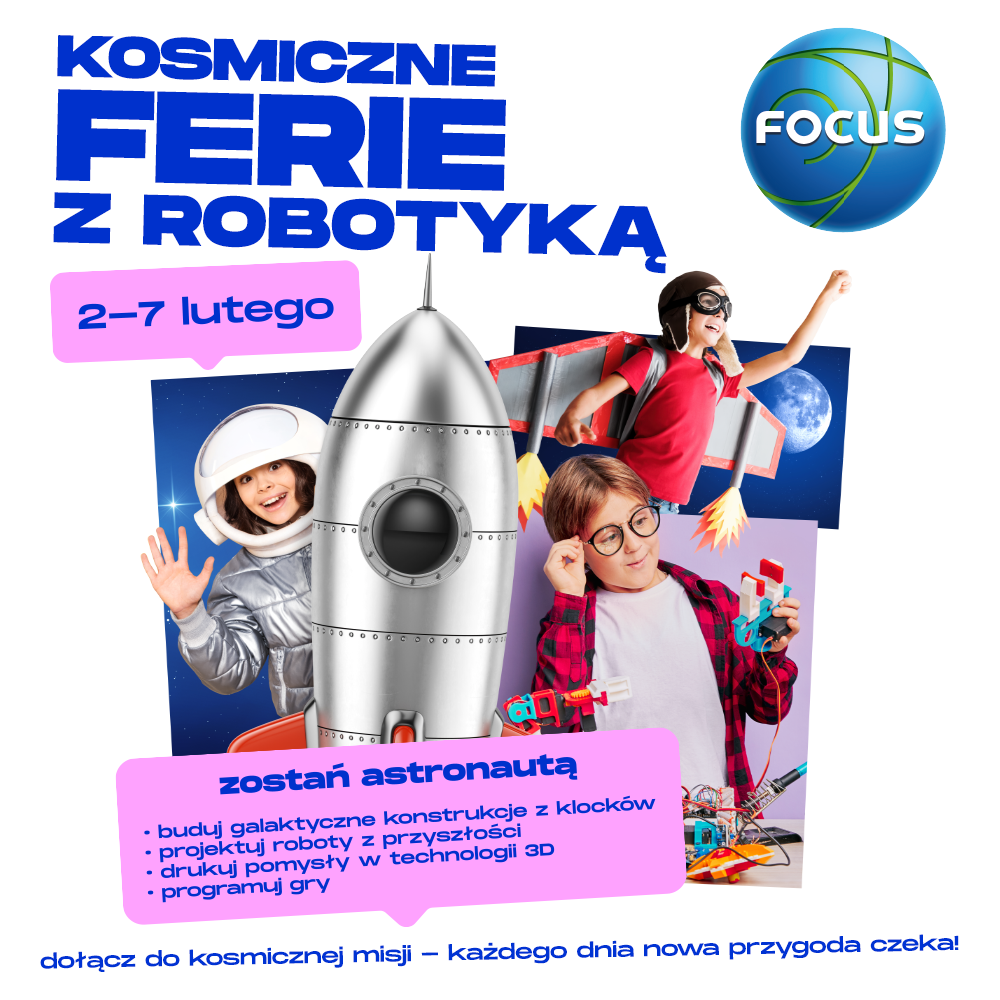 Zapraszamy wszystkie dzieci, rodziny oraz grupy zorganizowane na Kosmiczne ferie z robotyką, które odbędą się w dniach 2–7 lutego w Focusie. To znakomita okazja, by spędzić ferie zimowe w sposób nie tylko zabawny, ale i rozwijający wyobraźnię, kreatywność i logiczne myślenie!