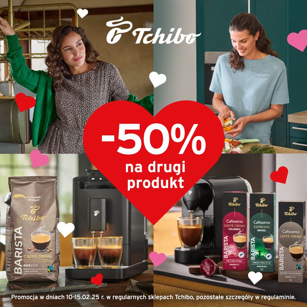 W dniach 10-15/02 kup jeden produkt, a drugi otrzymasz z 50% zniżką❤ Pyszna kawa? Stylowa odzież? Przydatne akcesoria kuchenne?😍 W Tchibo znajdziesz wszystko, czego potrzebujesz🥰
